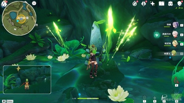 秘境【晴雨的经纬】的开启方法:在法留纳神机(大树干)处,小地图西南方向的通道过去,点亮草元素方碑,跟着绿光过去,弹琴拿健壮的草种子,借助四叶印过来,射击上面的草环,即可打开草屏障了,过去交互下,即可解锁秘境。