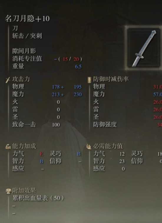 这把是太刀模组。从游戏发售时就一直很好用,属于是开荒武器里坚毅不倒的常青树了,战技的居合出手极快,削韧能力也很强。由于这把装备比较吃智力加成,所以法师可以装备它,等后期力量点上来了可以用来平替暗月大剑。这把武器的唯一缺点就是,土龙boss有点难打。初见不容易过,萌新需要多练习一下。