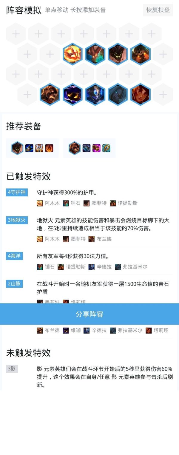这套阵容以6法为核心,稳定触发6法师(石头有法转装),4守护神,2山脉,4海洋,要是有地狱火转职装还可以凑齐三地狱火羁绊。充足的输出,蓝量补充,足够前排以及控制使得阵容强度非常高,基本是胡了就吃鸡的阵容。