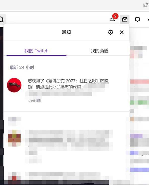 搞定之后你应该就能看到twitch主界面右上角“通知”标志有一条消息,点开通知就可以看到验证码了(这里建议先把验证码抄下来),这条消息会自动跳转到GOG平台2077兑换码的兑换界面,登录或确认你的GOG账号后再输入验证码,兑换即可。