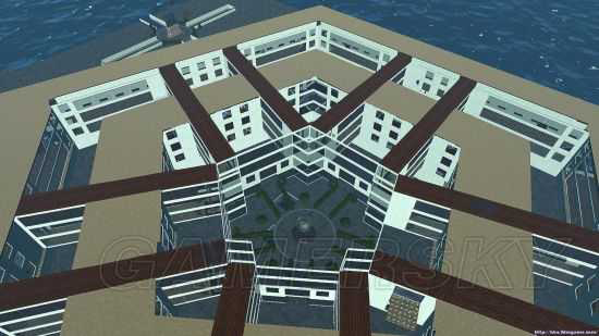 五角大楼严格按着正五边形几何规律来制作的!最外围每条边长全部都是8个建筑地基单位!五角大楼设计为从外而内由大变小3个正五边形阁楼组成!由外而内依次变小的正五边形边长递减3地基单位