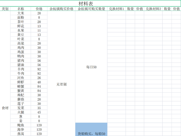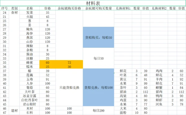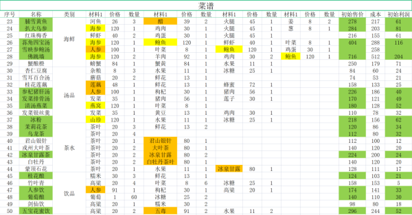 绿色的菜谱是综合考虑入手时间、初始价格、利润之后,推荐优先升级的菜谱。橙色的材料是只能兑换或者探索获得,黄色的材料是货船每船50个,需要考虑消耗量。