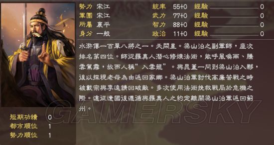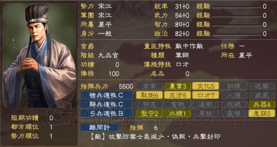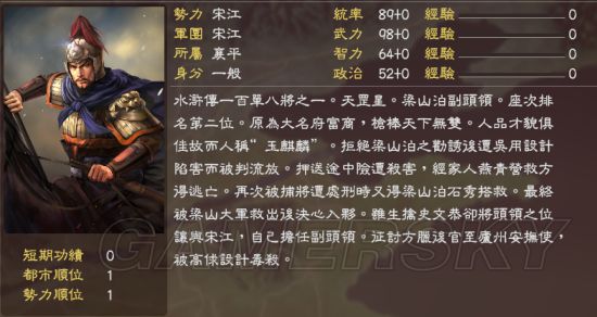 水浒传武将取自三国志11官方特典修改版。为什么是修改版?因为原版的三国志11水浒特典武将光荣设置的数值实在特别离谱,以卢俊义为例:统武都没过90(反倒五虎将个个双90),枪骑都不是S,反而弩兵S(被小乙逆输出了吗= =)于是就根据自己的理解进行了修改。