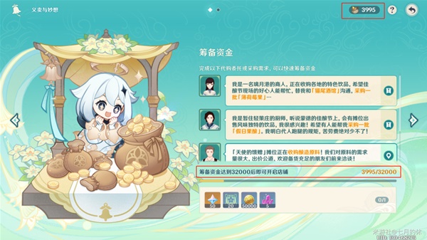 筹备资金达到3.2w摩拉,即可开店!筹备资金下面可以看到有4个任务,分别是2个代购和2个采购。代购是可以中间商赚差价的。即可获得任务位置。