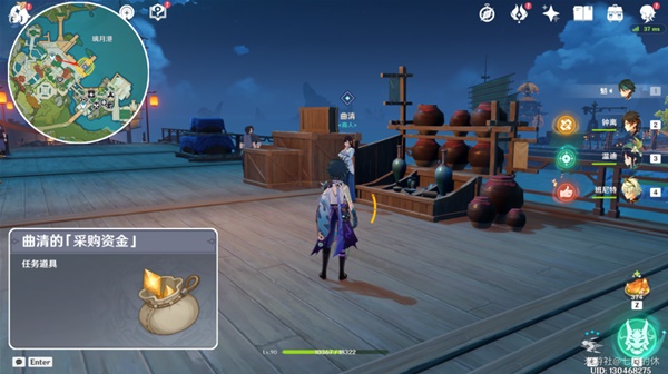 在璃月港码头,与曲清对话,获得2.2w摩拉采购资金,代购65箱薄荷莓果