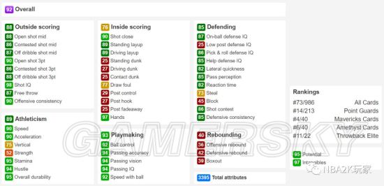 纳什相信就不用小编多费口舌去介绍了,让我们直入主题,这张纳什紫水晶卡由于偏向性较强,所以属性总值为3395,稍稍有些低,六大项中有一项高光、三项绿区、一项黄区和一项红区。进攻端这张卡外线能力还是比较不错的,投射能力均在85以上,其中空位三分更是有着90的数值;内线进攻能力较差,仅上篮可用,扣篮和背身都给到了最低的25。作为一名控卫,这张卡的组织能力和运动能力非常优秀,控球、持球速度均为92,传球三项均为94,速度/加速度为90,突破起来比较舒服。这张纳什的防守端在正常对位时非常不错,应有的属性都有,但由于他的低位防守智商给了最低的25、力量也仅有50左右,错位防守能力非常有限。身高191的模型打控卫刚好合格,这张卡并不适合冲框,还是选择突分和远投会比较顺手。