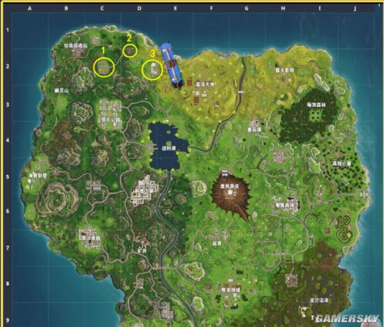 从地图上标出的圈,我们能看到本次讲的三个位置偏地图上方,选择跳这里优先注意第一个毒圈刷新的位置,毒圈的位置关系到我们的路线安排。