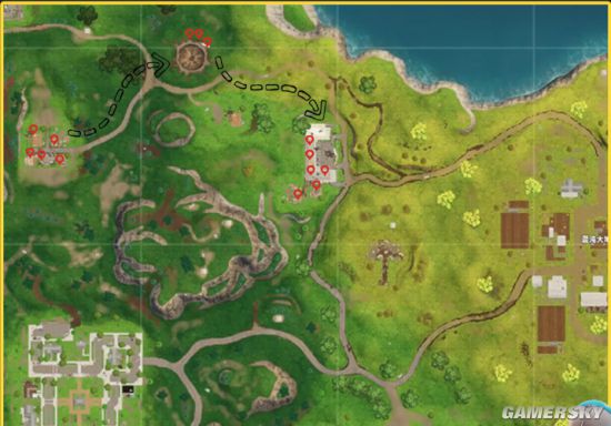 现在我们看下放大后的地图,图中的红点标注了宝箱的数量及位置: