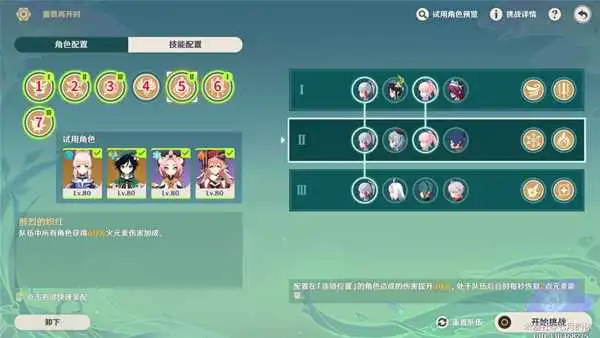 2.每关需要进行3轮战斗挑战,根据试用角色和自有角色随意搭配队伍。