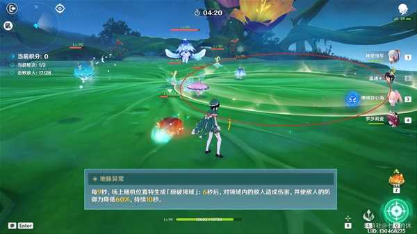 3.每9秒,场上会随机生成一个这样的领域,会对领域内的怪物造成伤害,并减防御60%,所以带了聚怪角色:温迪、砂糖、万叶,建议把技能丢到领域内,把怪吸到领域内,即可借助buff快速击杀。