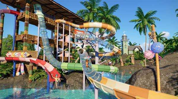 完成泳池的基本建设后就可以给水上乐园建造我们的“水上过山车”——水上滑道设施了。大型滑道的复杂程度跟传统过山车也有的一拼,你同样可以调节它的刺激感、恐惧感、恶心感。滑道的种类有开放式、封闭式、半透明式,我们知道《过山车之星》初代可以以游客的第一视角体验过山车,本作依旧保留了这个功能,同时我们还可以以第一视角游玩水上滑道,本作在视觉效果上有了不小提升,包括水面光影、水花特效等,将镜头拉远也可以看到泳池波光粼粼的视觉效果,水上乐园的新玩法可以说让玩家体验到了更深度的沉浸感。
