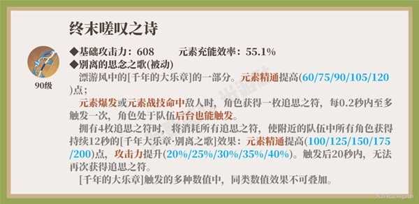①柯莱装备终末嗟叹之诗后,元素战技、元素爆发命中后都可以增加层数,可以快速触发别离之歌效果,为队伍提供额外元素精通、百分比攻击力进而提高队伍的输出能力。