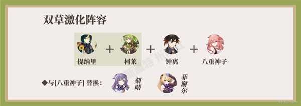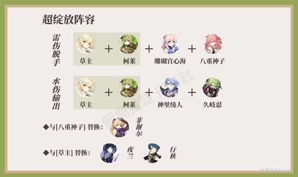 【注】草主也可以替换为夜兰、行秋以此提升队伍的输出能力,这是柯莱需要提高自身充能效率。
