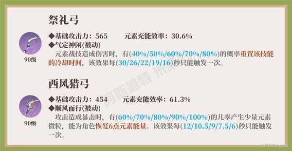 ①以功能、辅助向为培养方向,那么优先选择副属性为充能效率的武器,如终末嗟叹之诗、祭礼弓、西风猎弓、落霞;