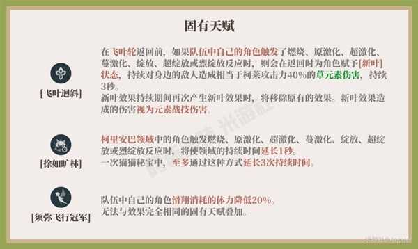 ①该天赋的触发限定在“从飞叶轮的投掷到飞叶轮的返回”这段时间内队伍的角色触发了草元素相关反应,对于草元素反应队伍而言很容易做到,不论是其他角色触发草元素相关反应,还是柯莱的飞叶轮本身触发了草元素反应都可以触发