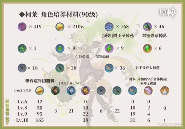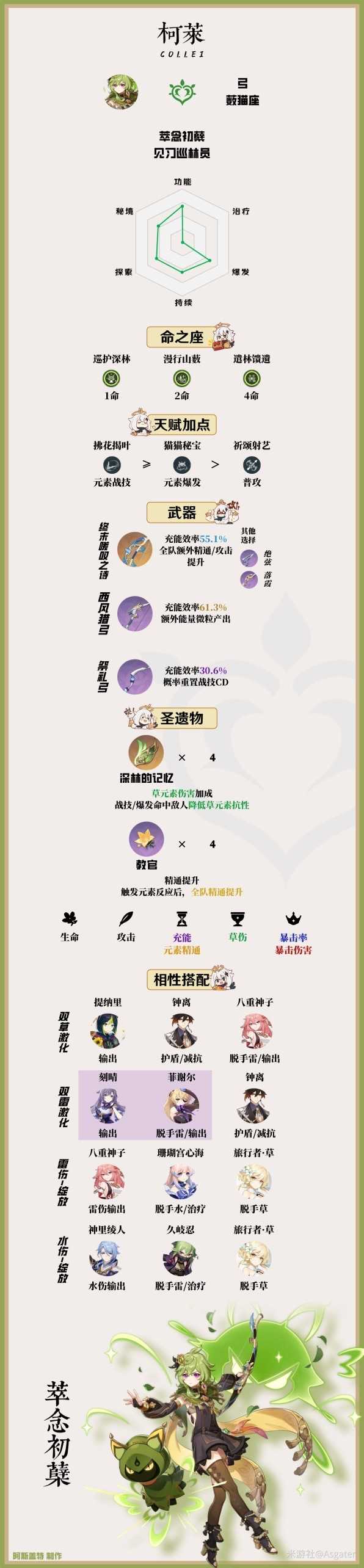 《原神》柯莱是3.0新增的角色,并且拥有新加入的草属性,很多玩家不知道她该如何培养,下面请看“Asgater”带来的《原神》柯莱一图流培养指南,希望能够帮助大家。