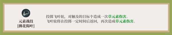 ②飞叶轮的投掷、返回均造成1次弱草元素附着,通俗的说即是丢出飞叶轮、飞叶轮返回这两个阶段可以对每名敌人共造成2次草元素反应