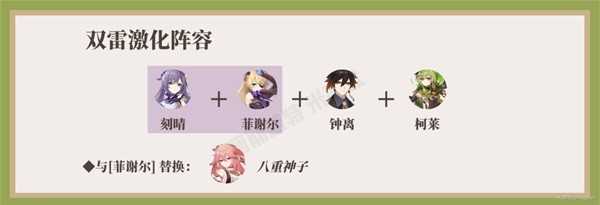 ①.与双草激化类似,队伍中至少存在2名雷、草元素输出角色。此阵容中,雷元素角色担任主要输出,刻晴、菲谢尔都有着可观的雷元素附着频率,菲谢尔脱手挂雷、刻晴站场爆发伤害可观。