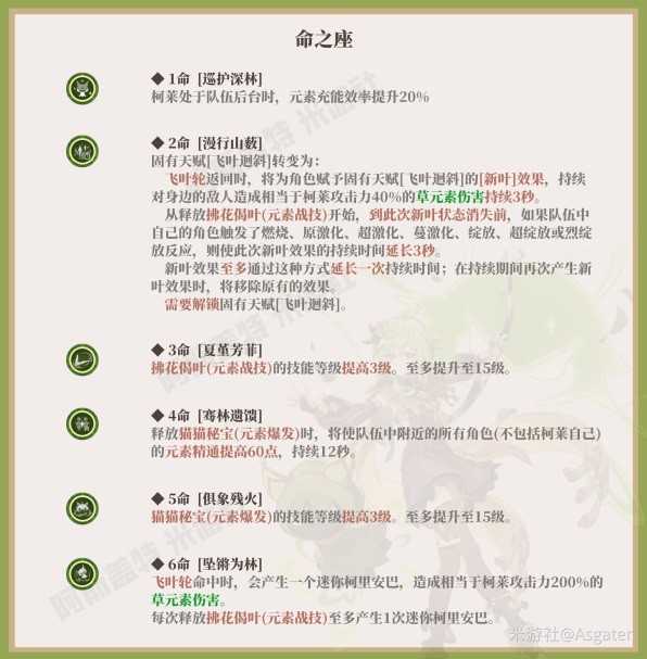 ①命座1提高柯莱后台充能可以优化柯莱作为脱手草、速切副C的能量循环