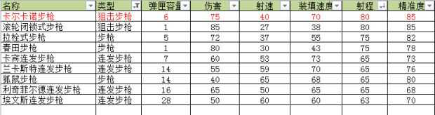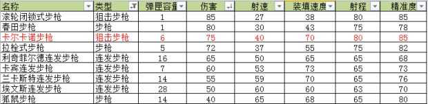 荒野大镖客在主机版本中,自带狙击镜的狙击步枪是使用不了自动瞄准功能的,另外步枪也可以装配高倍瞄准镜,所以造成了卡尔卡诺这把枪几乎没有什么人用。但是在pc版本出现后,键鼠的瞄准操作直接使这把狙击枪变成非常值得购买的一把优秀武器,下面来看一下他的参数与其他步枪包括连发步枪的参数对比。