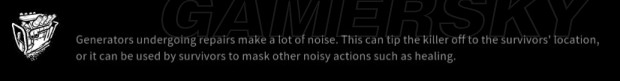 当生还者修理发电机时,会发出大量的噪音(咔哒咔哒声),这可以提示屠夫生还者所在的位置(根据发电机是否被修理来判断),或者这些噪音也可以提示某位生还者去寻找其他人,例如正在被治疗的人