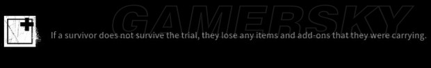 如果一名生还者没有在本场试炼中存活下来,那么他将会丢失他所携带进入本次试炼的道具以及附加品(例如医疗包,手电筒,工具箱以及它们的配件)补充:携带祭品“白护卫”可以在本次试炼中防止你因为死亡而导致附加品丢失。