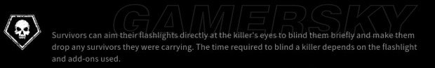 生还者可以正确使用他们的手电筒照射屠夫的眼睛(也就是脸)来短暂的晃瞎他们,当杀手扛着某位生还者时,晃瞎他们可以让其背上的生还者挣脱,晃瞎杀手的速度以及晃瞎持续的时间取决于手电筒的品质以及其所携带的附加品(萌新晃什么晃老老实实上树)