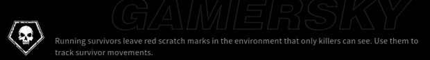 奔跑的生还者将会在环境中留下红色的印记(红线),并且这些印记只有杀手才能看见,杀手可以通过印记在追踪生还者的去向(印记存在时间为10s,并将会在6-7s后开始变淡)。