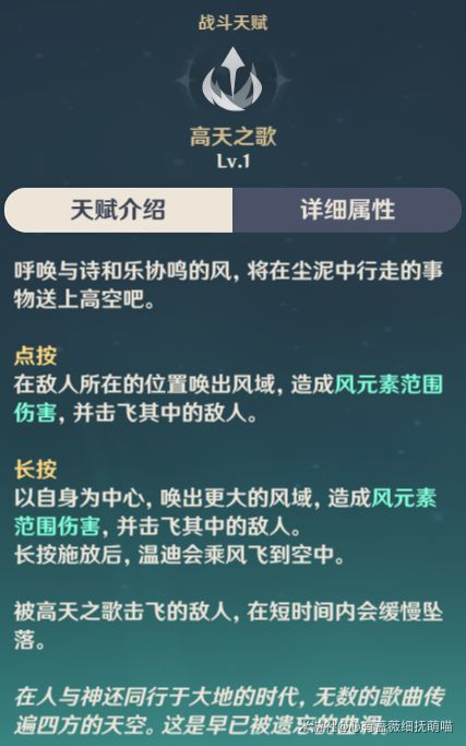长按:冷却15秒,从按下开始后0.8秒后进入冷却开始计时,温迪从按下到可以自由行动有3秒的不可控时间,在人物正下方释放,会击飞敌人并造成伤害。