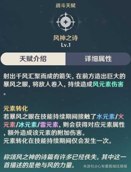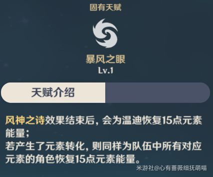使用元素爆发:风神之诗后,为温迪恢复15点元素能量,若产生了元素转化,为队伍中所有对应元素角色恢复15点元素能量。直接恢复,而不是产生元素球,所以是后台直接增加,双风队中充能的来源。