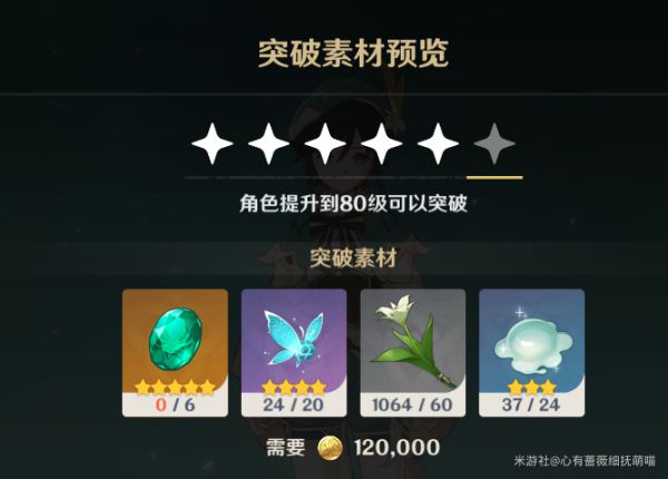突破等级6额外增加24%的元素充能效率,加上自带的100%元素充能效率,裸面板元素充能效率为124%