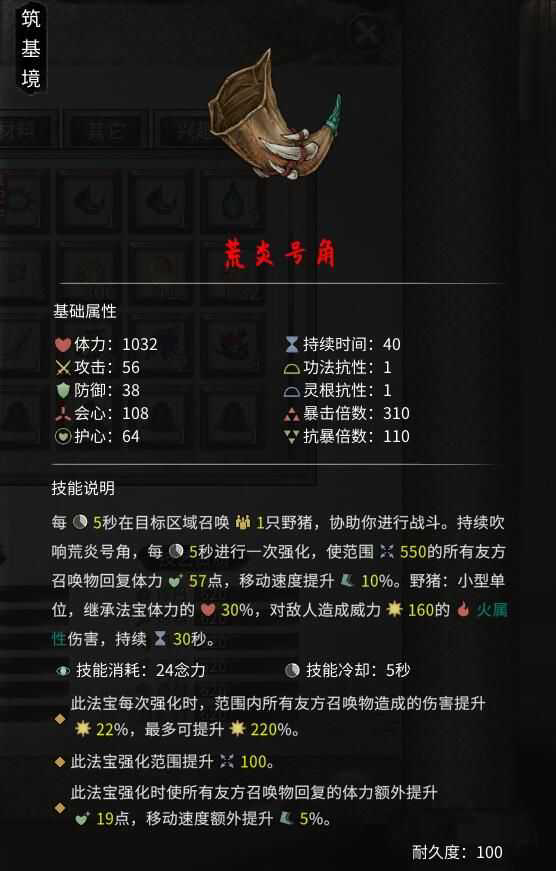 2.再号角制作时产生有“怪物伤害加成”和“召唤物攻击”两条词条的法宝