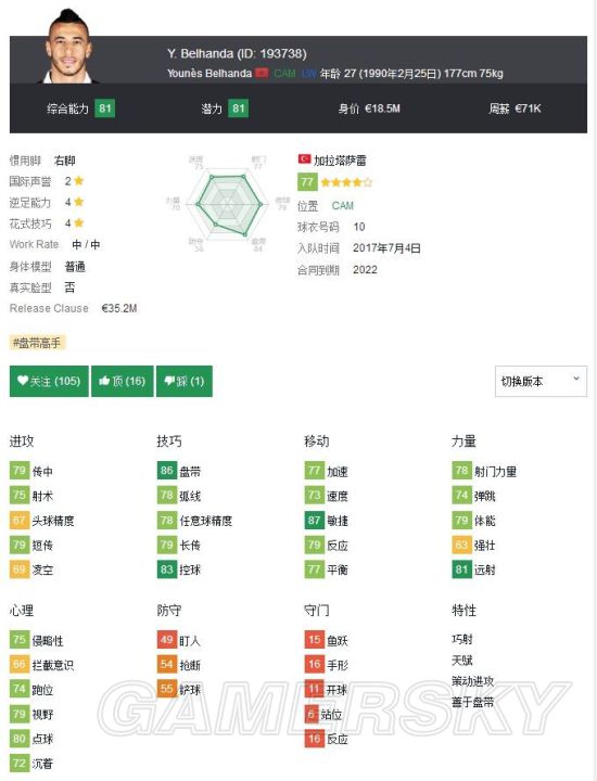 这名尤文图斯的中后卫曾经效力于罗马和拜仁,是这支摩洛哥队中大赛经验最丰富的球员。89点的强壮和86点的拦截意识让他的正面拦截能力出色,防守属性中88点的盯人以及84、86点的铲抢也是非常高的,但是速度和技术上的短板让他很需要与队友之间的配合和保护,今天凌晨的欧冠比赛,正是因为贝纳蒂亚的失位犯规送给皇马点球,导致尤文图斯功亏一篑。游戏中一旦使用不当就很可能导致后防被打穿,这一点一定要注意。