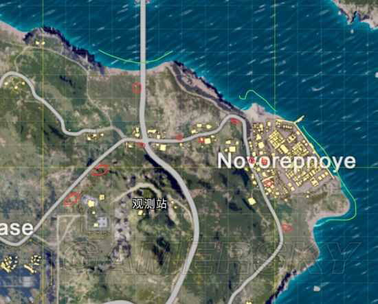 红色圈圈是刷车点,p城其实刷车点较多,而且处于地图中心,基本在不刷机场圈的情况下,第一波毒是不用跑圈的,而且p城的资源十分丰富,在不进行激烈的消耗战的情况下,从p城出去还是很可观的。