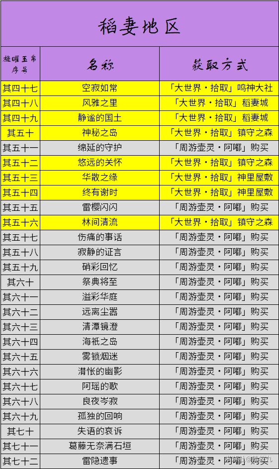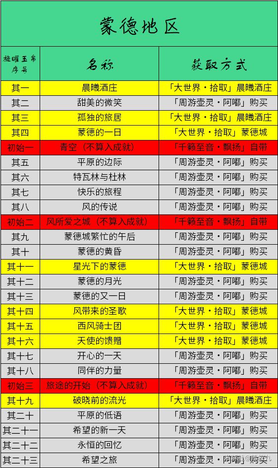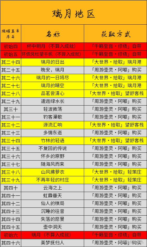 若旅行者之前解锁音乐的时候,没有统计自己使用的「旋曜玉帛」,可以对照下面表格,来确定自己还剩哪些「旋曜玉帛」还没有获取。
