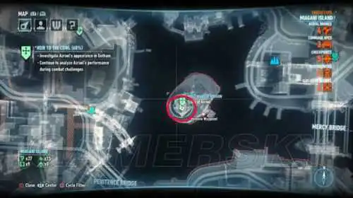 在4个位置楼顶,找到燃烧的蝙蝠图案,与Azrael对话后,需要无伤完成战斗挑战。