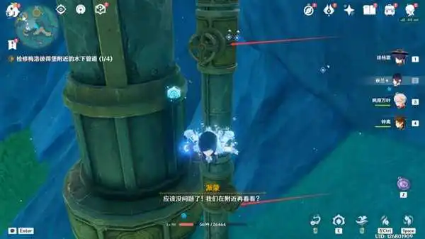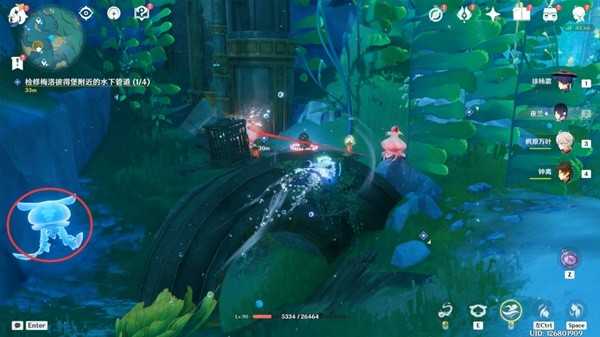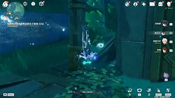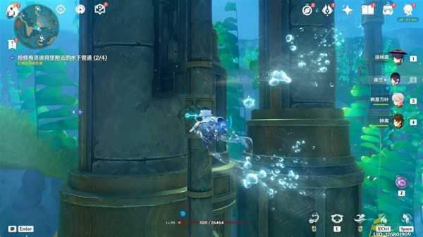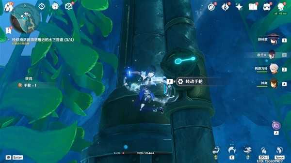 8,第四处,在管道下方吸收猎刀鳐的能力,切割海草后获取手轮,然后将手轮安装在管道上,转动2次即可。