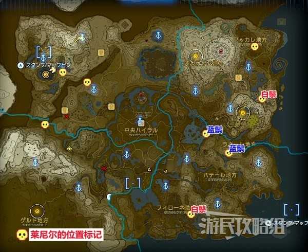 下图中骷髅标记为部分莱尼尔出现位置,未标明颜色的为尚未确认颜色的莱尼尔。目前已确认的部分位置为:
