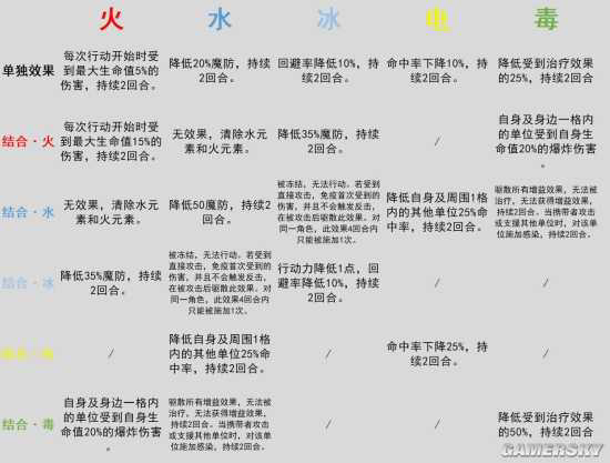 4.元素反应——可以到任一元素法师的转职界面,通过五个传奇元素法的名字右侧元素图标来了解,我这里直接上图记录一下。