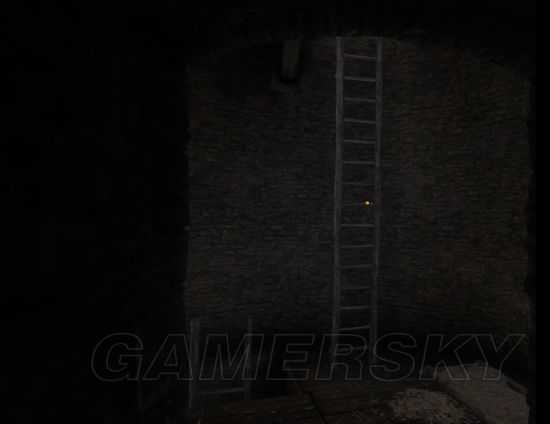 走廊尽头是个塔楼的小门,然后门口看到一个梯子,顺着梯子向上爬。