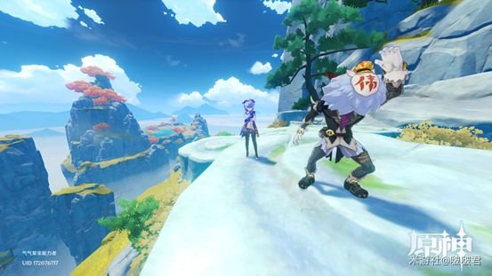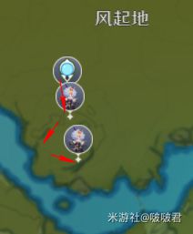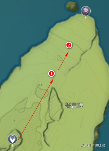 传送点出来后往悬崖方向走,走到1风元素起飞处(周围会刷新雷元素史莱姆),这个地点正上方是个大眼睛,是传送到深境螺旋的传送门。我们乘风飞到一半,往前到2,