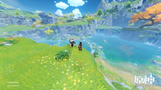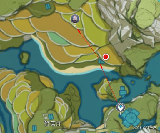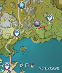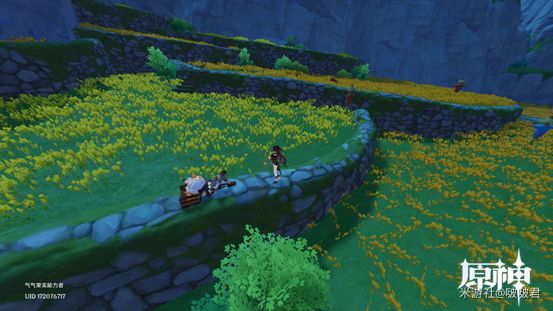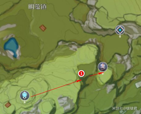 从传送点出来,往下飞,到1沙滩上的房屋(屋檐有个鸟窝)上,到这里使用元素视野,如果远处岩属性的大史莱姆都刷新了,而没有大伟丘就可以走了。如果刷新了就继续往前走,大伟丘就在梯田的边沿上躺着。