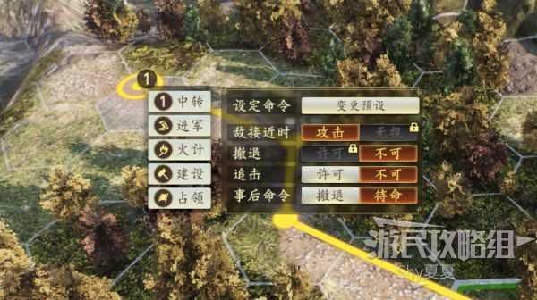 在委派部队出阵时的命令设定中,将【敌接近时】设为【无视】,部队就不会擅自攻击敌人。但是,某些武将会因为个性的限制而无法设为【无视】。