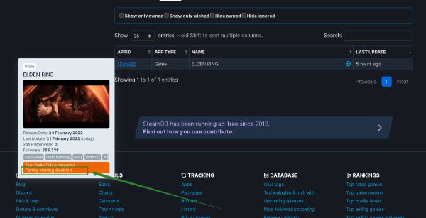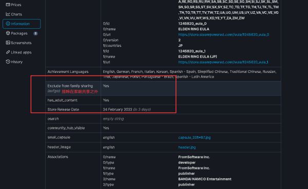 从SteamDB的数据库显示,《艾尔登法环》并不支持家庭共享功能。