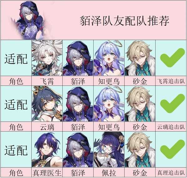 貊泽的定位就是半辅助半副C的定位,有点类似托帕,是托帕的下位替代。这样的定位注定貊泽无法单C,伤害根本抗不起一个队伍的大旗,更适合搭配主C角色。也因为他的主要输出是追击,因此他最适合的队伍就是追击队。托帕能进的队伍,貊泽同样能进,比如说真理医生、飞霄、云璃的追击队,辅助的话选择知更鸟、阮·梅更好,生存辅助最优选砂金,其次符玄。