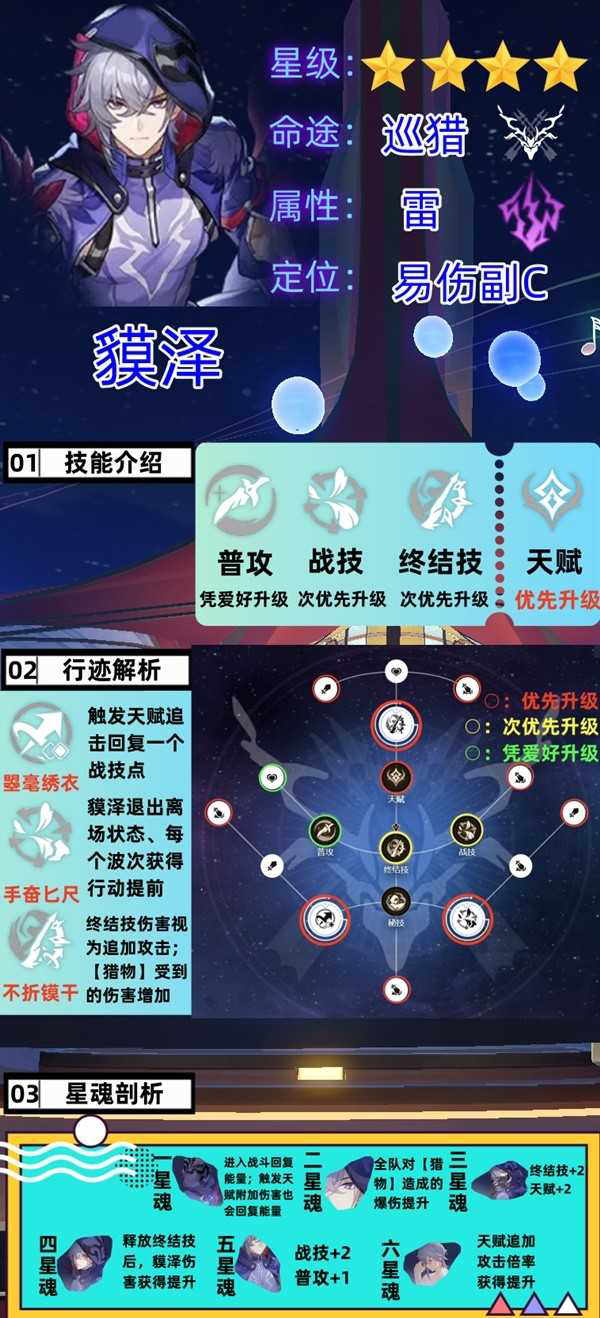 貊泽是雷属性巡猎命途的角色,依靠战技给敌人标记,队友攻击造成天赋的附加伤害和协同攻击作为主要输出手段,同时被标记的敌人附加易伤、爆伤加成的状态,是一个半副C半辅助的角色。