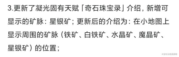 在官方的公告得知,凝光的天赋「奇石珠宝录」由只能在小地图上标示铁矿,白银矿,水晶矿更新为了可在小地图上显示铁矿,白银矿,水晶矿,魔晶矿,星银矿。