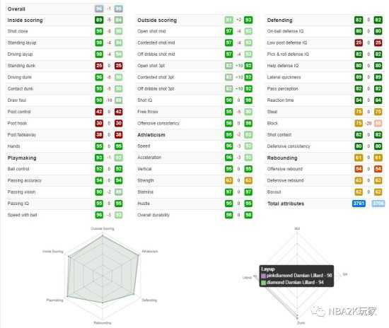 相比于刚出没多久的钻利拉德而言,这张时刻粉稍稍加强了一些内线进攻能力和中投能力,但三分三项比钻卡每项都低了10个点,而且防守端除了盖帽之外都没有增强,所以其实实用性上并没有提高多少。