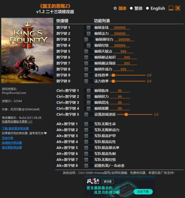 简体、繁体、English,可以切换语言 (切换语言后修改器将把该语言设置为默认语言)