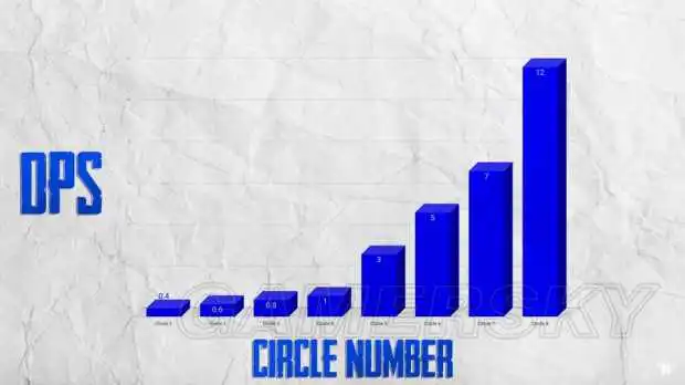 6.蓝圈距离增伤的幅度,一直到第4圈为止,仍然都是比较温和的;第4圈即使距离蓝圈很远,伤害最高为每秒1.5,仍只有第5圈基伤每秒3.0的一半而已。